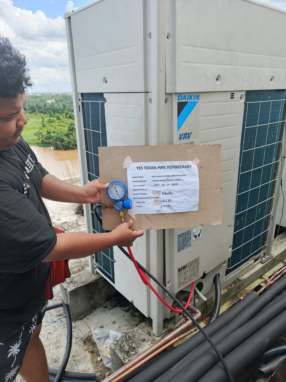 Teknisi memastikan tekanan freon sesuai standar agar AC dapat mendinginkan ruangan secara optimal.